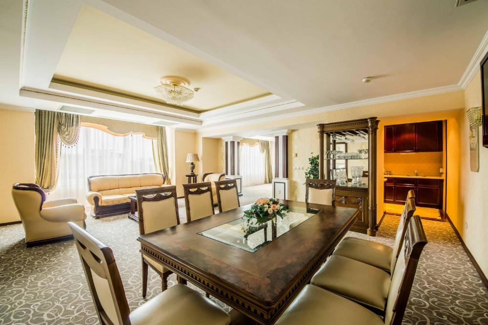 This suite features a fireplace, flat-screen TV and a kettle. The bathrooms come with bathrobes, slippers and free toiletries. One of the bathrooms has a spa bath and a sauna. It has 2 bedrooms, a dining area and a living room. The suite offers views of Independence Square and the Church of St Simeon and St Elena.