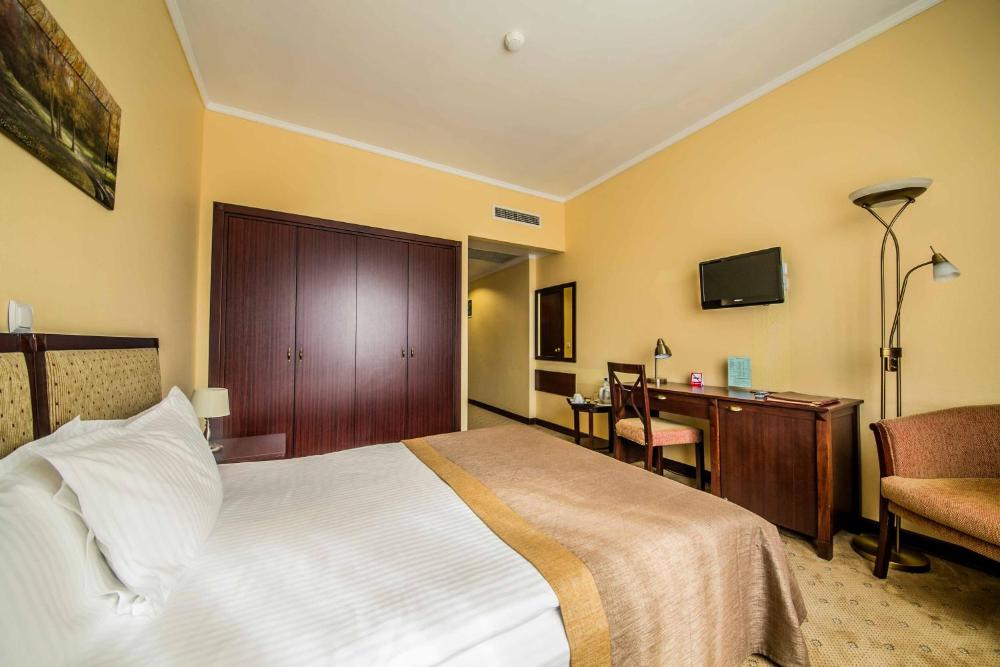 Spacious room decorated in neutral colors offers a TV, kettle and complimentary toiletries in the private bathroom.
